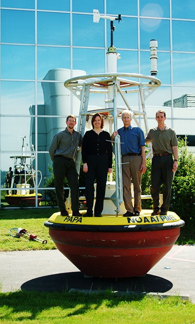 The buoy is part of a National Science Foundation (NSF) grant awarded to oceanographers at the University of Washington and Oregon State University, working in collaboration with scientists at NOAA’s Pacific Marine Environmental Laboratory (PMEL), and at Fisheries and Oceans Canada and the Institute of Ocean Sciences in Sidney, B.C.