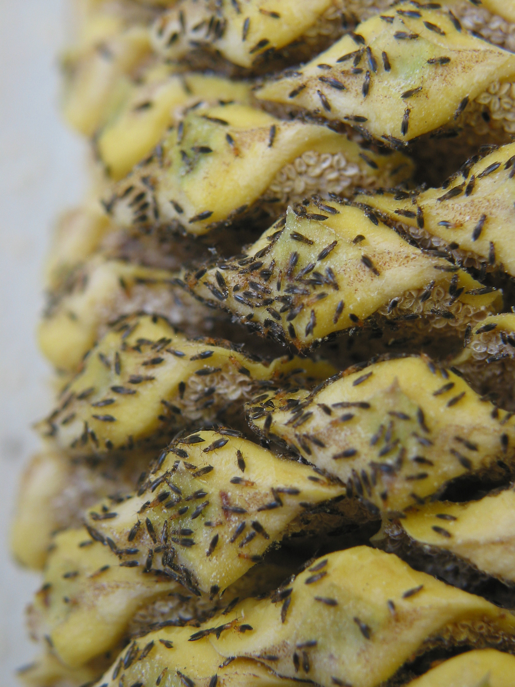 Thrips try to enter the green cone of a male cycad plant before the cone opens. The insects feed on pollen in the male cones. University of Utah researchers found that certain cycad plants make themselves hot and smelly as a way to drive the insects of out male cycad cones and into female cycad cones, where the insects fertilize the plants.