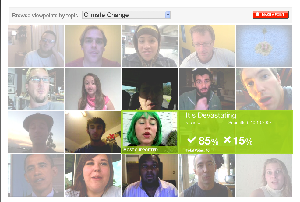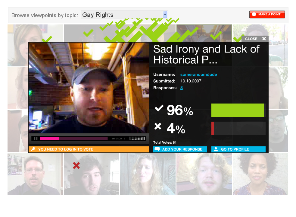 Alright Al, I’ll bite. I gave the site a look. My first impression was “gaaaahhh flash!” but at least the interface is well thought out. Basically it is a sort of opinion based youtube/digg hybrid. You post a video with your opinion, and then people vote on it. I thought it was kind of cool the way that when you held your mouse over the windows it told you how many voted for or against that opinion. Holding your mouse over the faces also produces little check marks or X’s float around their picture the size and number of x’s and checks is dependent on the votes.
